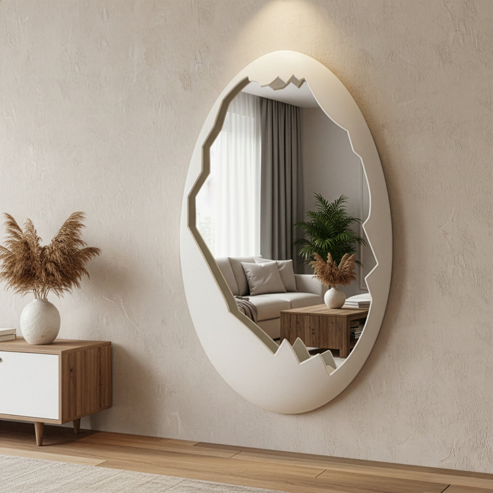 O-Voilà Bianco ist ein Spiegel 100% Made in Italy, hergestellt aus recyceltem ABS mit fortschrittlichen Thermoformungstechniken. Der Raum zwischen Rahmen und Spiegel reflektiert die Schale, wodurch ein einzigartiger und raffinierter Tiefeneffekt entsteht, als ob der Betrachter wirklich in einem Ei wäre. Ein wirklich originelles Möbelstück, das Ästhetik, Nachhaltigkeit und Symbolik vereint.
