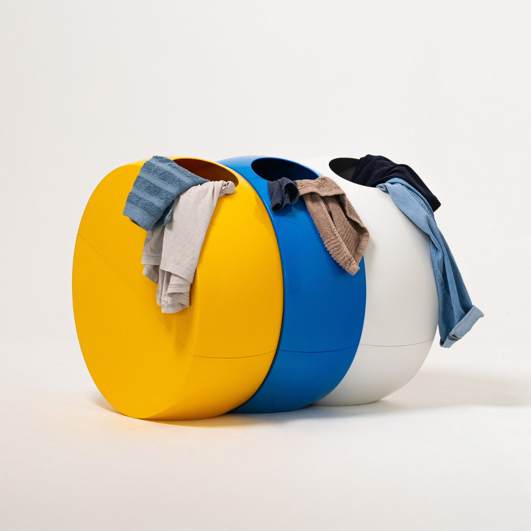 Buc besteht aus zwei Teilen: einer Basis und einem Deckel. Zum Öffnen einfach den Deckel anheben. An den vier Ecken von Buc befinden sich Stangen, während der Baumwollbeutel mit Taschen ausgestattet ist, die in die Stangen eingehängt werden, um ihn richtig zu fixieren. Du kannst den Baumwollbeutel herausnehmen und deine Wäsche bequem in den Waschbereich transportieren.