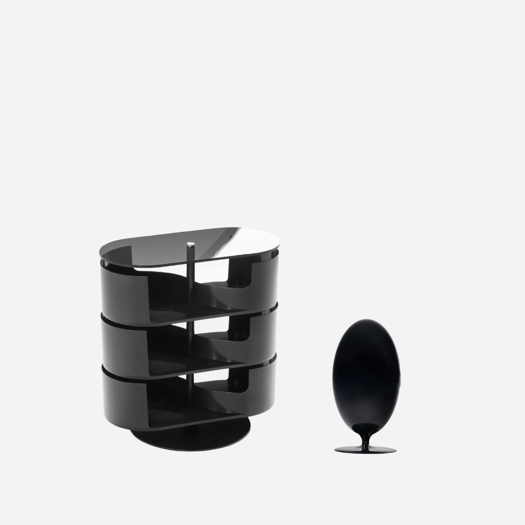 Infinity Table ist ein Tisch, 100 % Made in Italy – die neue Version von Infinity mit drei Ablagen, veredelt durch eine robuste Oberfläche aus recyceltem Plexiglas. Er wurde so entworfen, dass er auch als Nachttisch dienen kann, und bietet eine praktische, multifunktionale Lösung für den Alltag. Die drehbare Struktur ermöglicht eine bequeme Organisation, während die feste obere Platte eine stabile Ablagefläche für alles bietet, was du in Reichweite haben möchtest. || Lovino ist ein multifunktionaler Organizer, 100 % Made in Italy, hergestellt aus recyceltem ABS. Sein magnetischer Verschluss schützt den Inhalt, während die inneren Fächer und integrierten Haken intelligente Lösungen für jede Anforderung bieten. Perfekt als Aufbewahrungsbox, Ablageschale oder Schmuckhalter – Lovino passt sich stilvoll deinen Räumen an und macht sie schöner und ordentlicher.