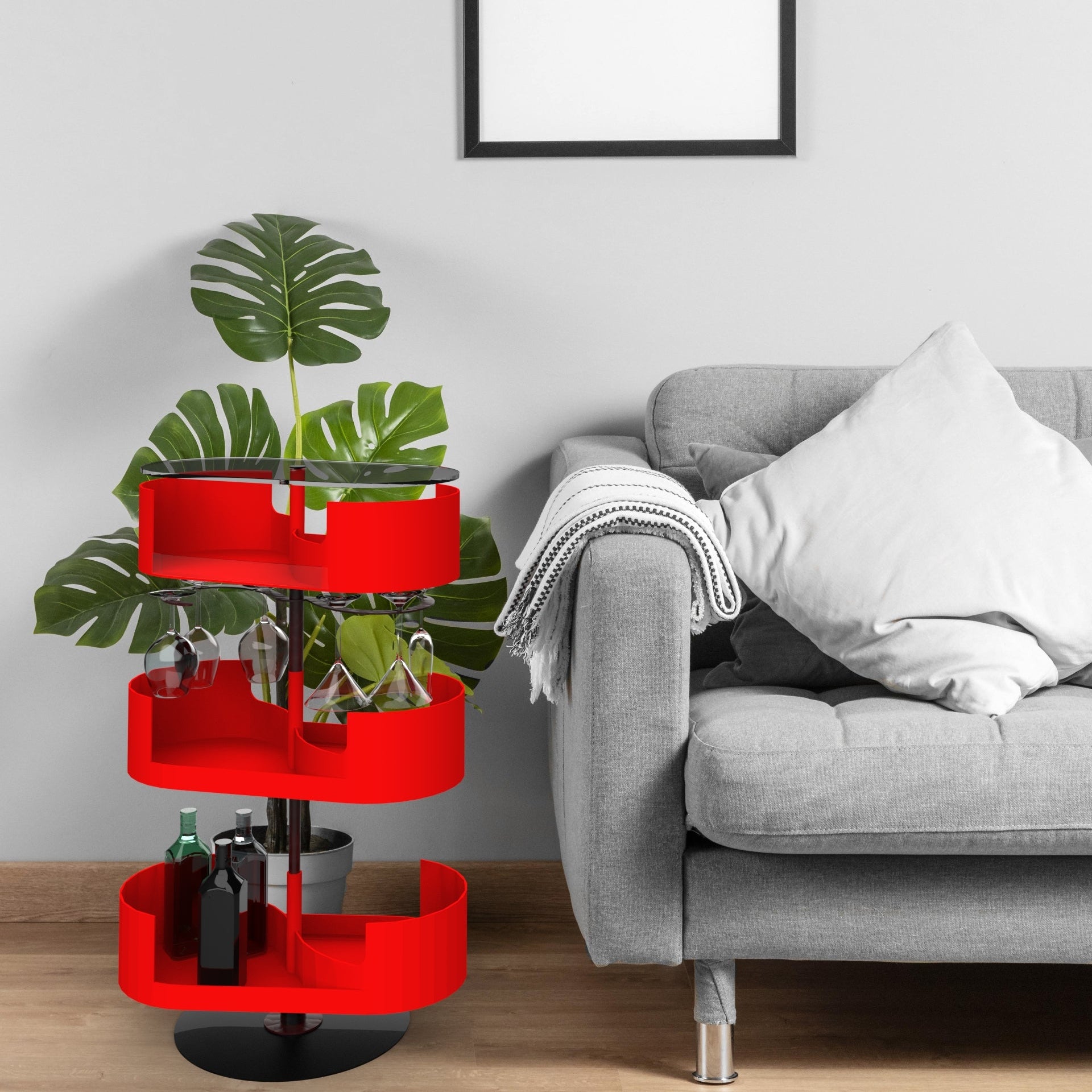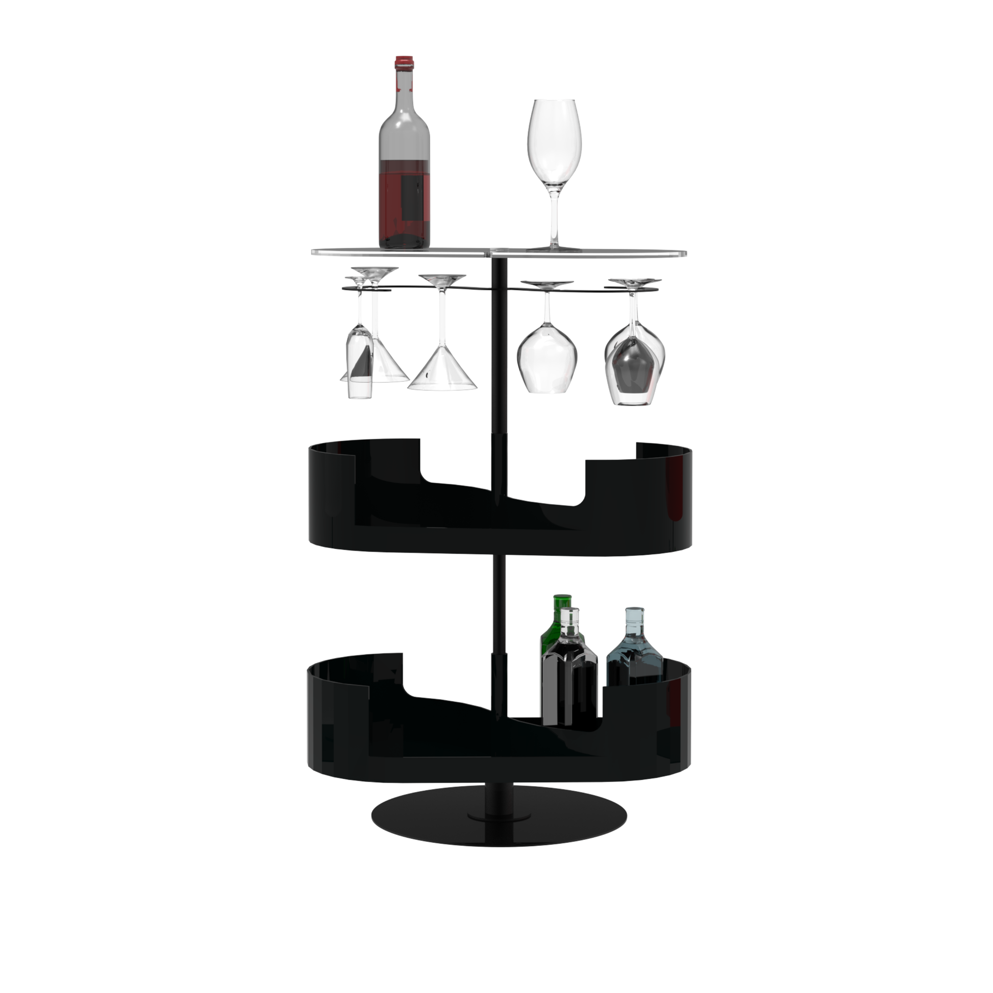 Infinity Bar Nero è un mobile bar di design, 100% Made in Italy, pensato per arredare living, open space e ambienti moderni. Disponibile in due versioni a 2 o 3 ripiani girevoli, è dotato di un piano superiore in plexiglass trasparente che diventa pratica superficie d’appoggio e di un porta bicchieri integrato per 6 calici da vino.