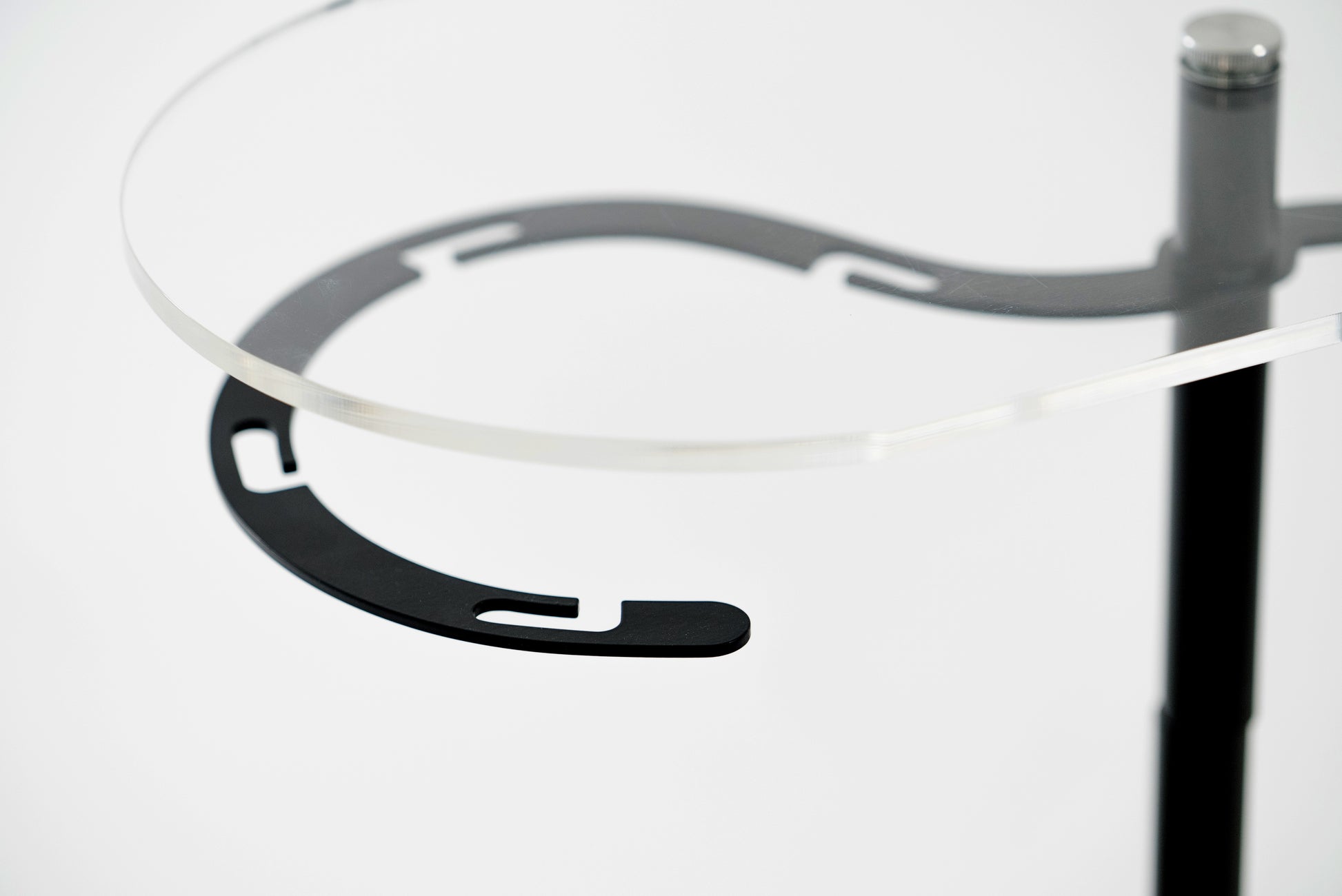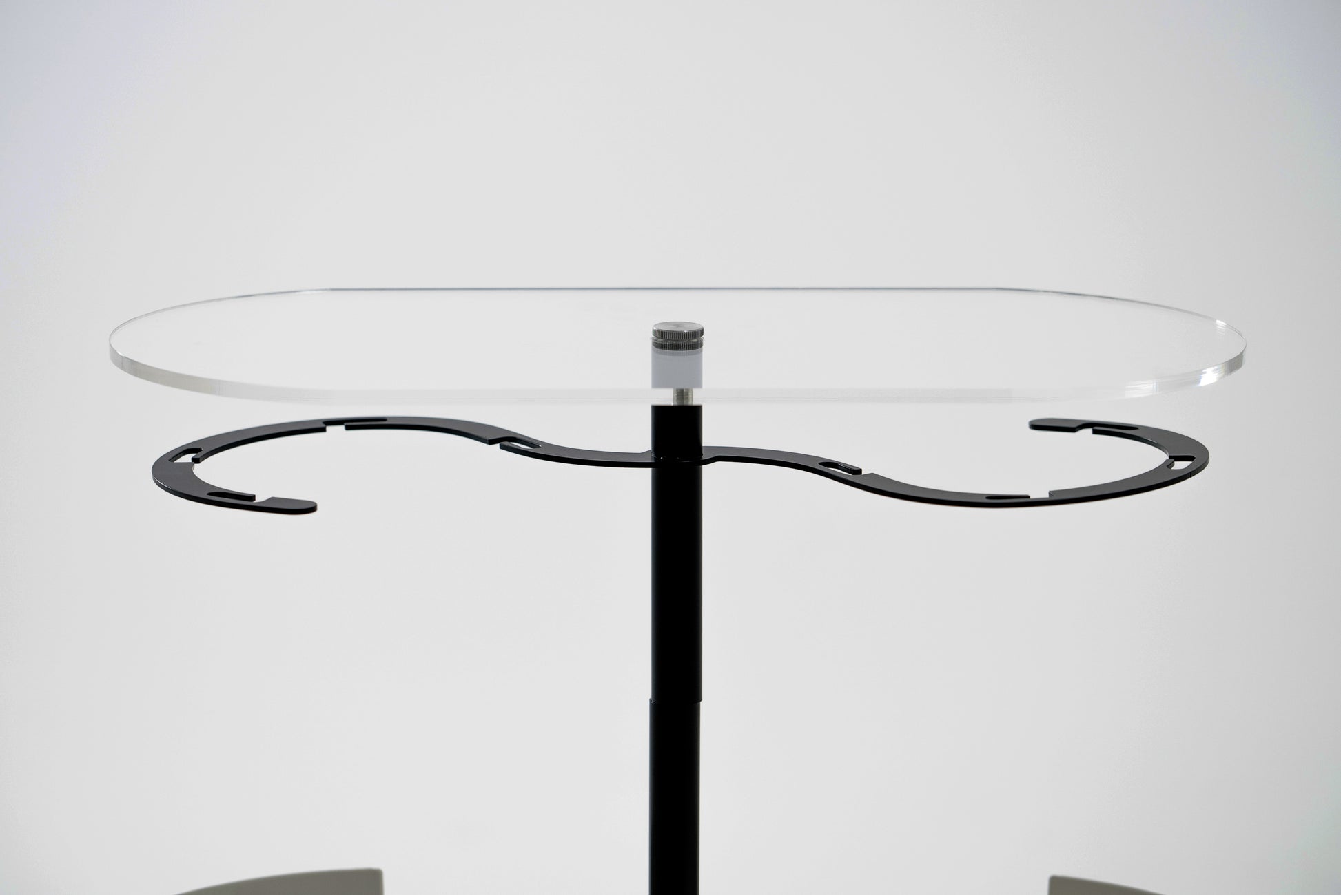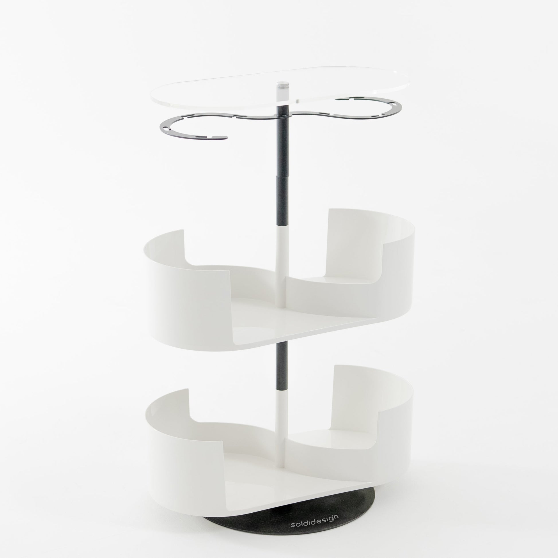 Il piano d’appoggio superiore è fisso, per garantire stabilità a qualsiasi oggetto che venga posizionato. I ripiani inferiori, invece, ruotano a 360° per offrire il massimo della comodità organizzativa