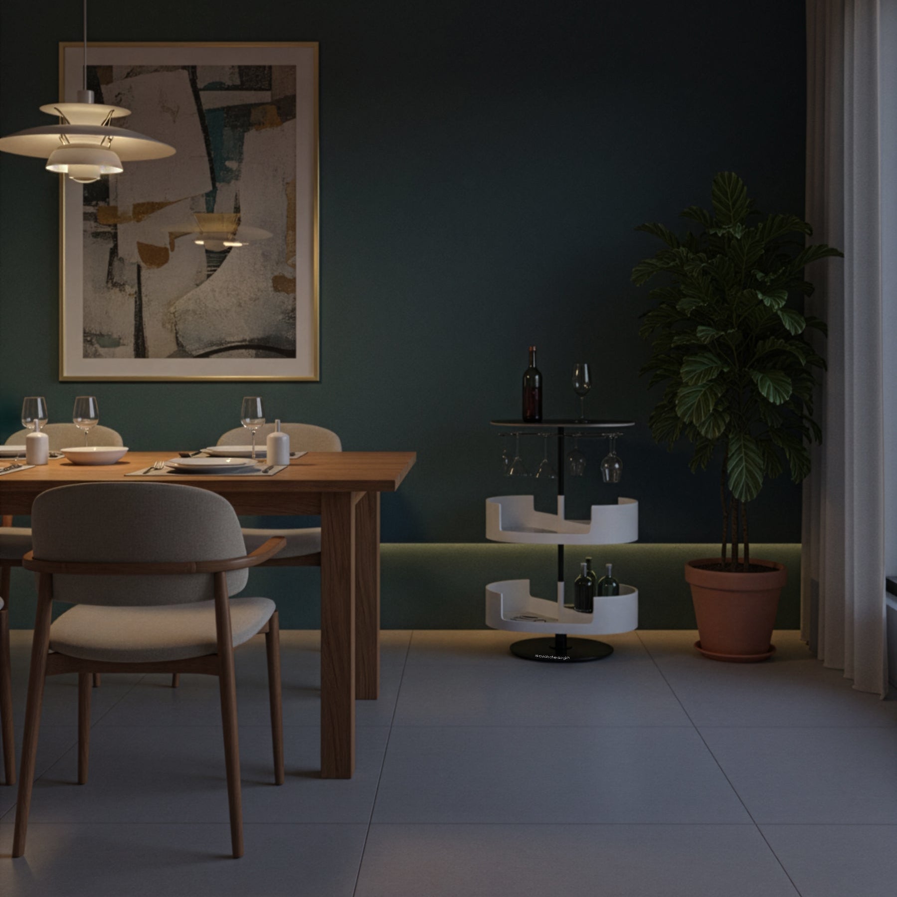 Infinity Bar è un mobile bar multifunzione pensato per contenere fino a sei calici nella struttura dedicata e per ospitare bottiglie, shaker e accessori. La sua struttura girevole ti consente di organizzare e accedere facilmente a tutto ciò che usi quotidianamente.