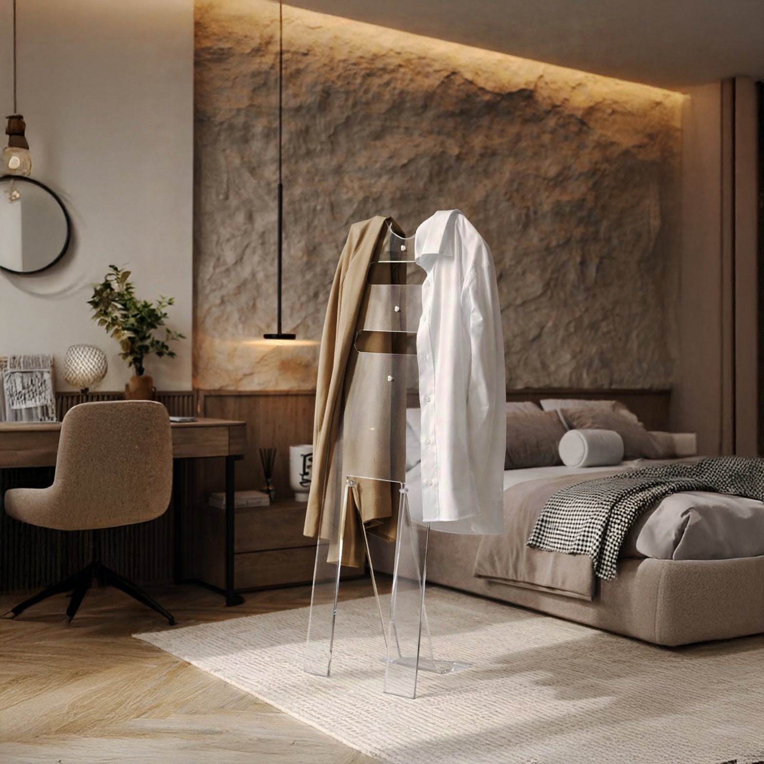 Silhouette riporta in casa il fascino di un oggetto semplice e utile, reinterpretato da Soldi Design con l’eleganza della trasparenza. Una lastra di plexiglass che si piega e si modella con leggerezza, diventando una soluzione discreta e raffinata per appoggiare abiti, asciugamani o capi che vuoi avere pronti all’uso. Il suo profilo sottile non ingombra e si integra in qualunque ambiente, dalla camera da letto al tuo bagno